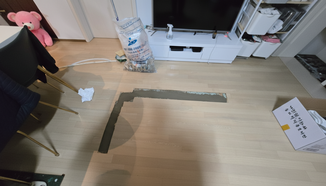 보양 작업 후 바닥을 개방했습니다. 난방관이 드러났는데, 노후화로 손상된 것이 확인되었습니다.