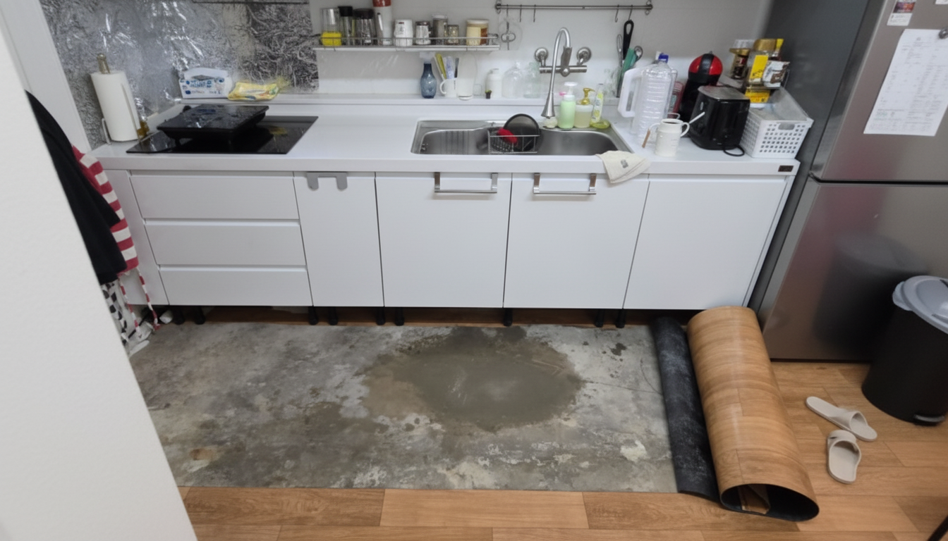 싱크대 급수 호스나 배수 호스에서 물이 조금씩 샌다면, 하부장 바닥으로 흘러 바닥 틈새를 통해 아래로 스며듭니다.