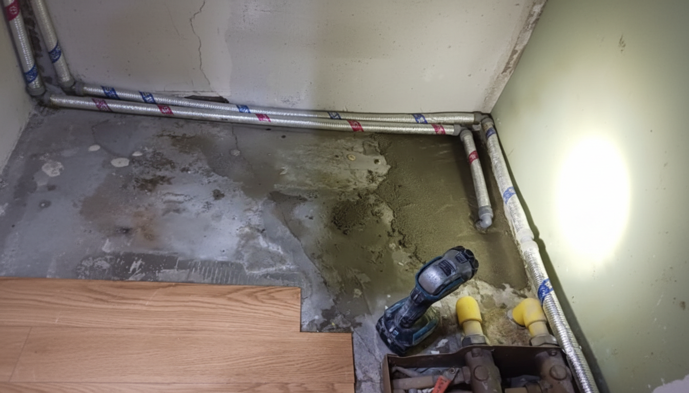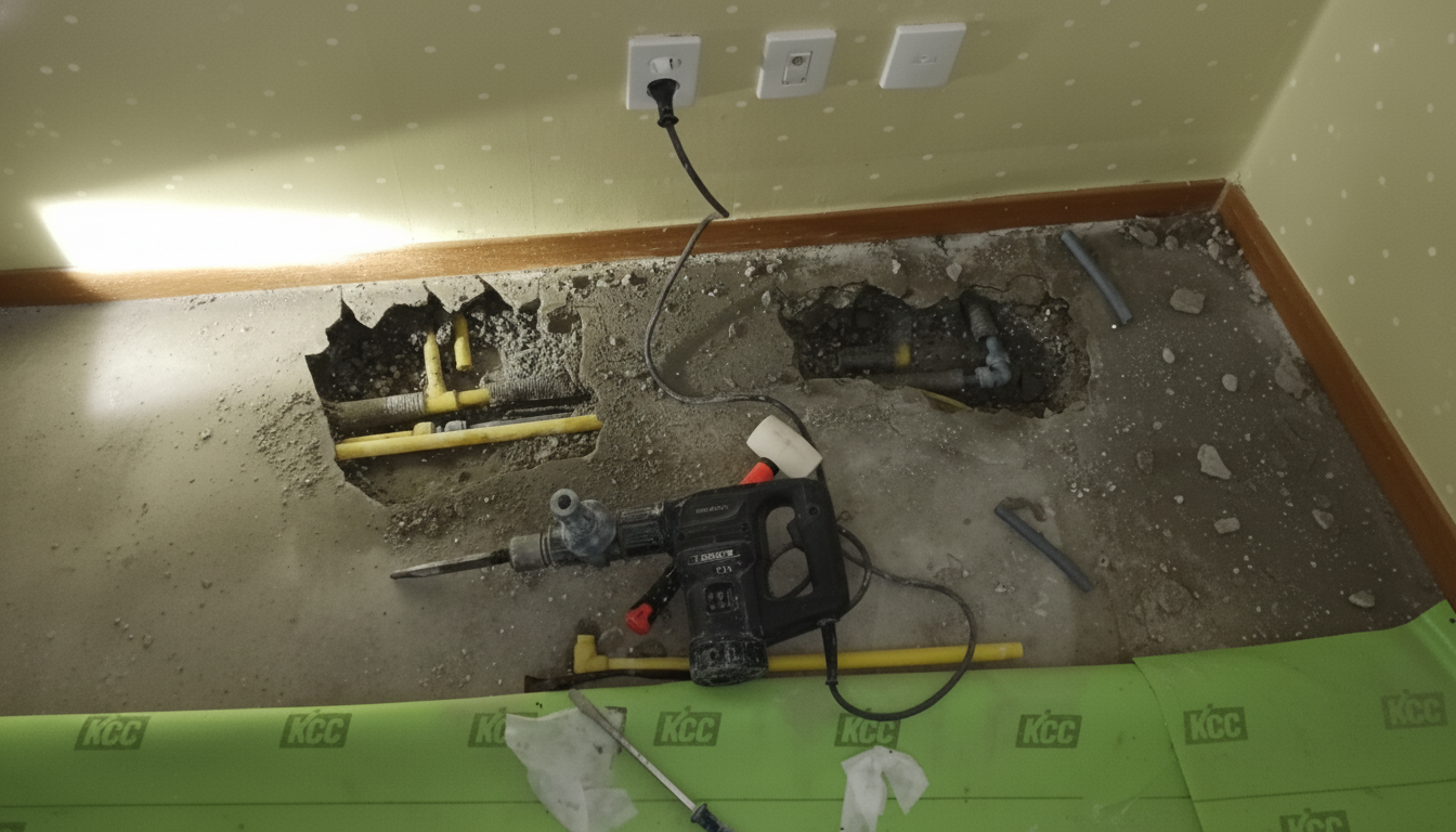 보양 작업 후 바닥을 개방했습니다. 냉수관 연결부에서 패킹이 손상되어 물이 새고 있었습니다.