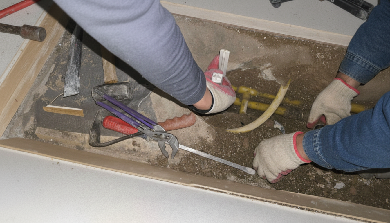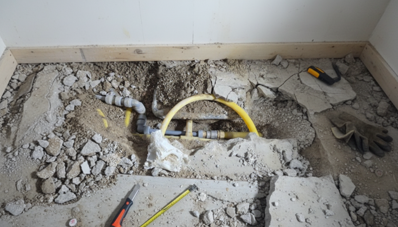 바닥 굴착을 통해 누수의 원인인 온수 배관을 드러냈습니다.