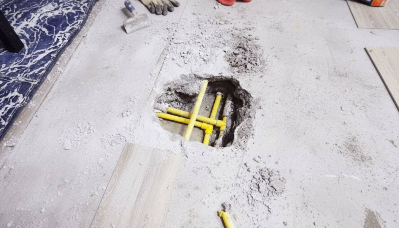 이후 바닥 장판을 걷어내고 조심스럽게 굴착을 진행해보니, 안쪽에 매립된 온수관이 노후화가 진행된 상태에서